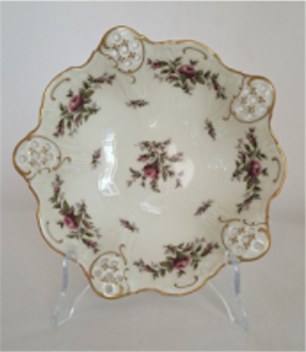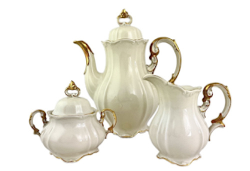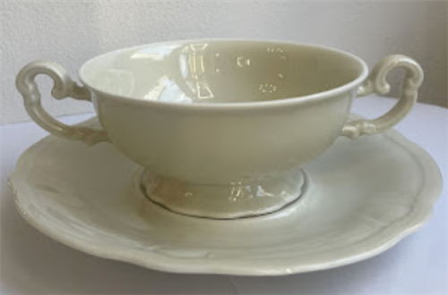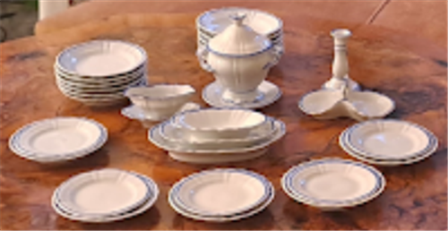 Jídelní servis pro panenky, 11 ks mělkých talířů, 6ks hlubokých talířů, 5 ks dezertních talířů, terina na polévku, 3 oválné mísy (koláče, pečivo, ovoce, ryby) slánka, svícen. Porcelán