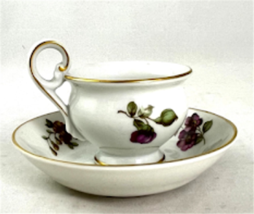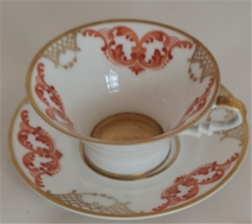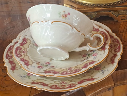 Porcelánový šálek s podšálkem a dezertním talířem, tištěný vzor.