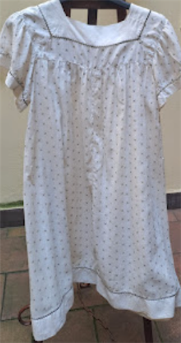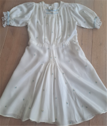 Dětské šaty s krátkým rukávem, vyšívané bleděmodrým a bílým květinovým motivem, zdobené modrou hedvábnou sametovou stuhou, krajkami, kanýry a tzv. žabičkováním. V pase poutka na provlečení modré stuhy. Zapínání vzadu na potahované knoflíčky.