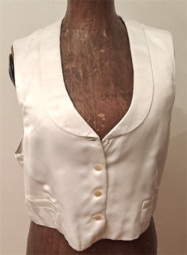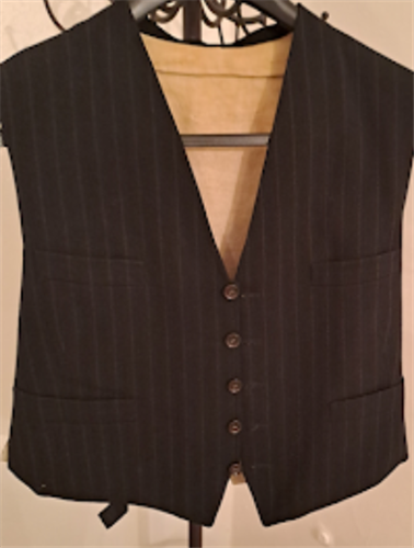 Proužkovaná vesta s rozparky, podložená světlou bavlněnou podšívkou. Saténová záda, spony na upravení velikosti.